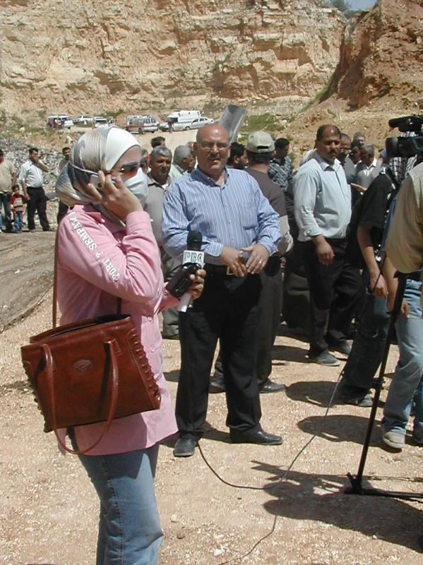 A reporter prefers to wear a mask as protection against the toxic pollution from the settler dump.