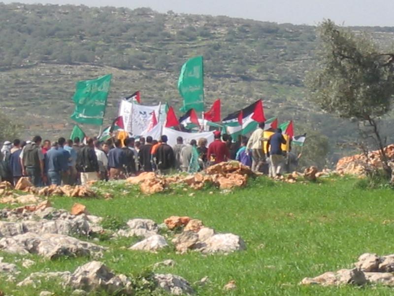 Demonstrators in Rafat walk towards the village's land being destroyed for the wall.